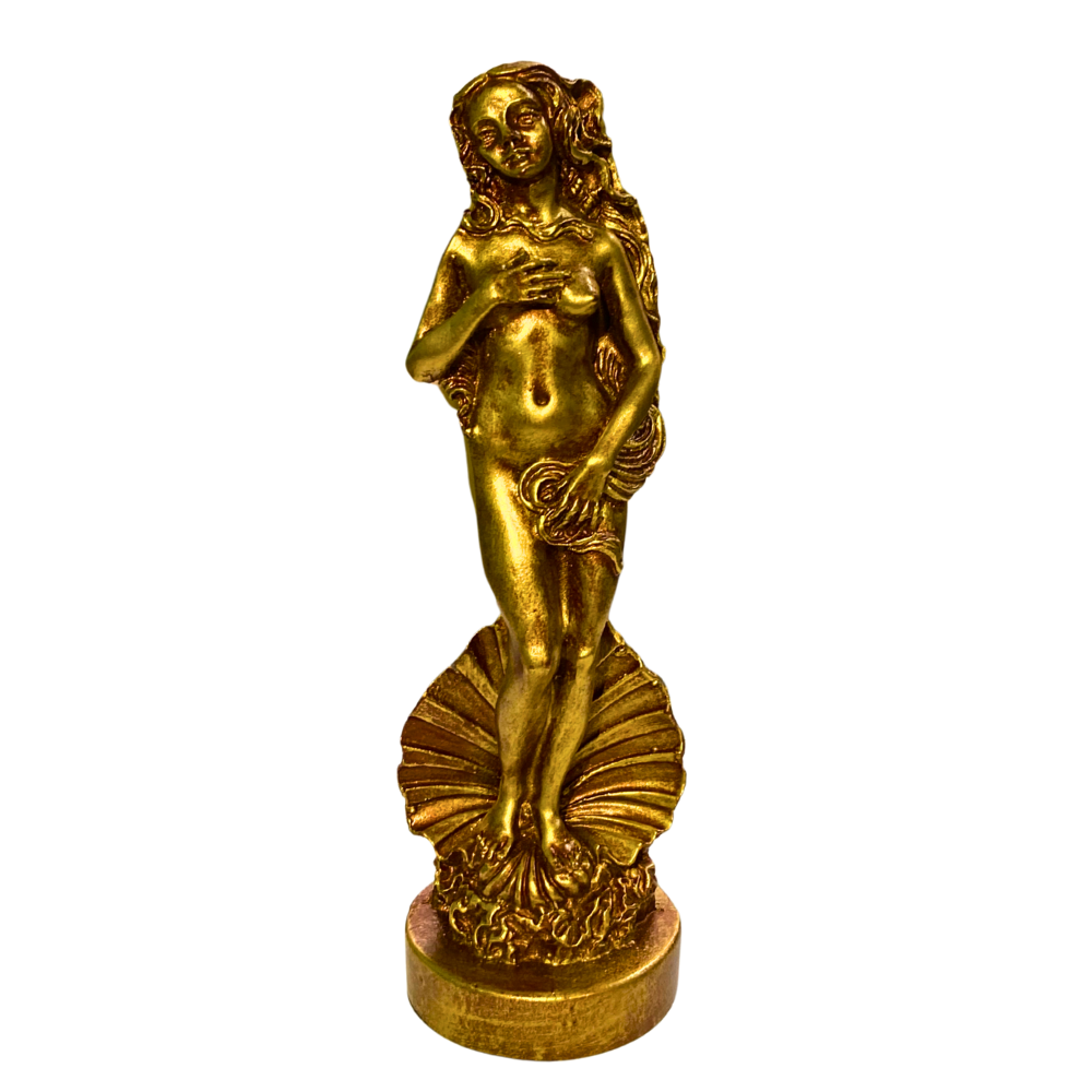 A Deusa que emergiu das águas para revelar ao mundo o poder do amor, da sensualidade e da beleza eterna. Esta estátua dourada de Afrodite (16 de altura x 4,5 cm de largura) é símbolo de magnetismo, fertilidade e encanto, ideal para altares, rituais ou como peça de inspiração diária. Uma representação que une elegância e energia sagrada para despertar a deusa interior.