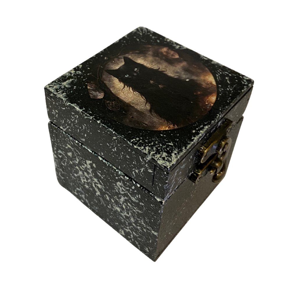 Com acabamento artesanal e efeito marmorizado, traz na tampa a imagem de um gato preto místico sob a lua, símbolo de proteção, sensibilidade psíquica e conexão com o invisível.