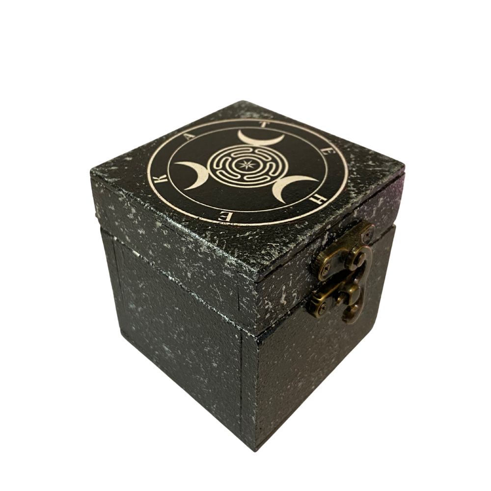 Caixa de espelho Hekate Strophalos Triluna, um item simbólico e poderoso para trabalhos de magia, proteção e conexão com a Deusa. A arte traz o strophalos, a triluna e o nome de Hekate, representando caminhos, mistérios e as três fases da Deusa.