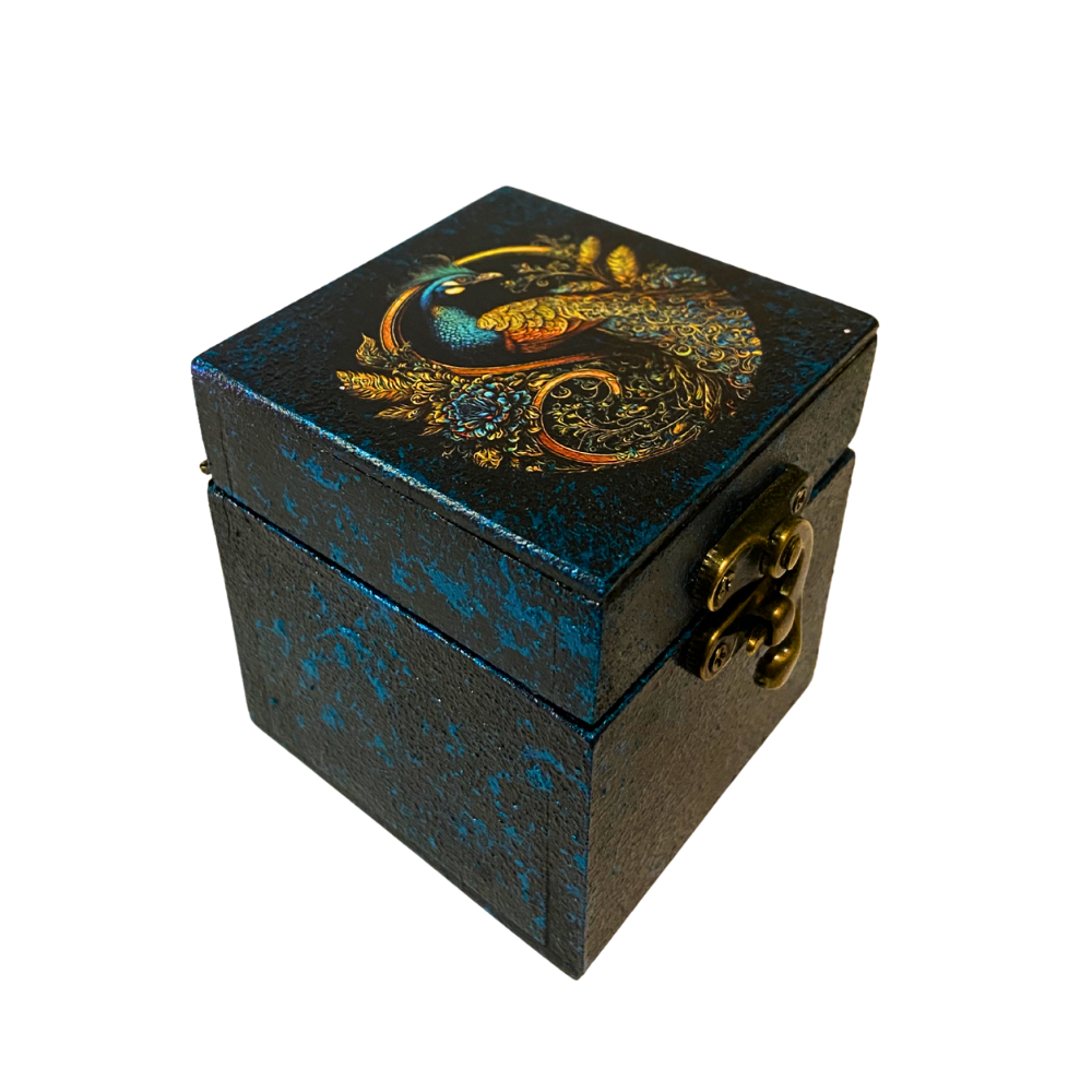 Inspirada no pavão sagrado de Hera, esta caixa traz a energia da beleza, da proteção divina e do olhar vigilante. A arte detalhada em tons profundos destaca as penas majestosas e simbólicas, associadas à realeza espiritual, autoestima e poder feminino.