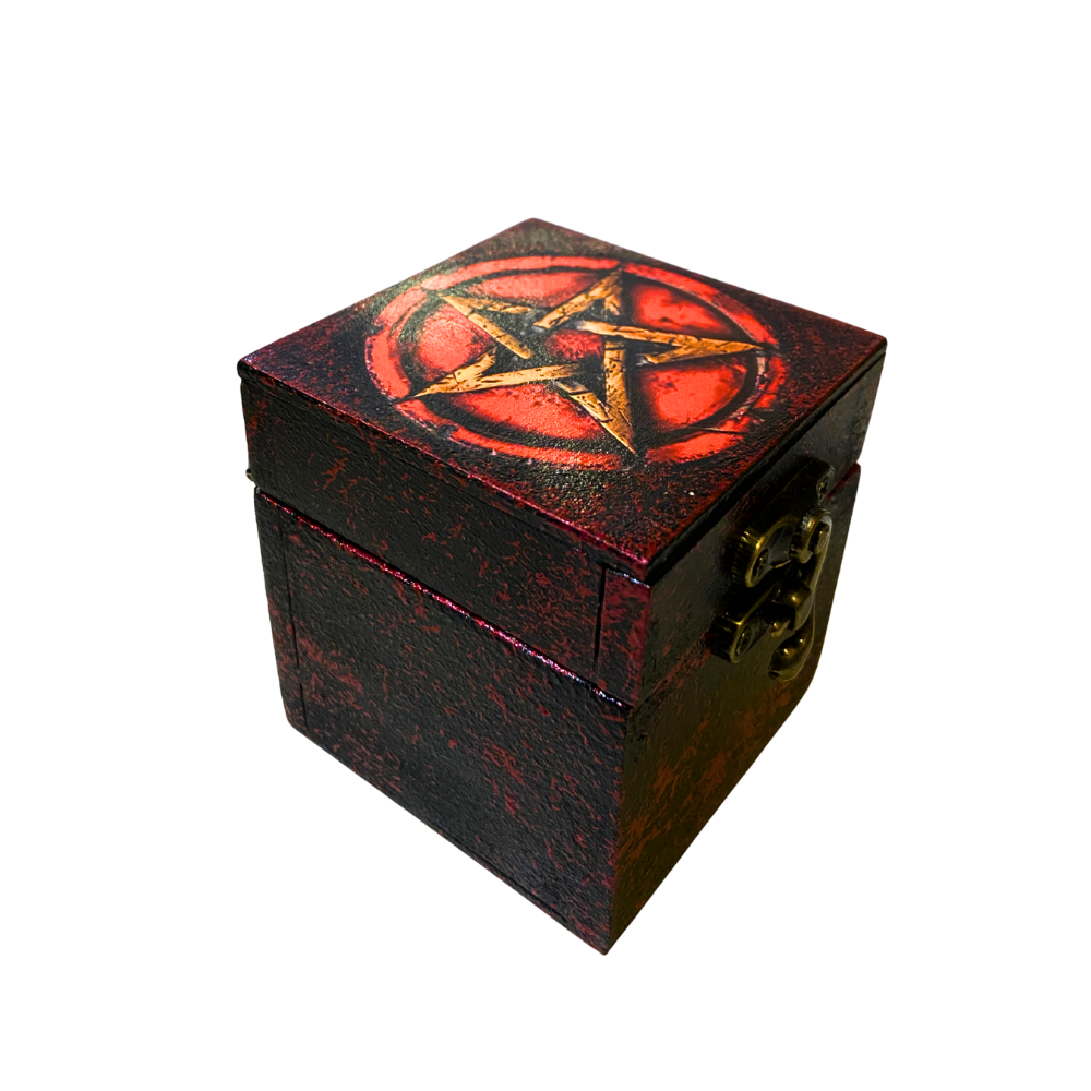Carregada na energia flamejante do elemento Fogo, esta caixa traz o símbolo do pentagrama em tons ardentes, representando força vital, movimento, paixão e transformação. O vermelho intenso ativa o poder de ação, coragem e proteção, enquanto o espelho interno potencializa qualquer trabalho mágico, refletindo e multiplicando intenções, limpando influências indesejadas e fortalecendo amuletos guardados dentro dela.