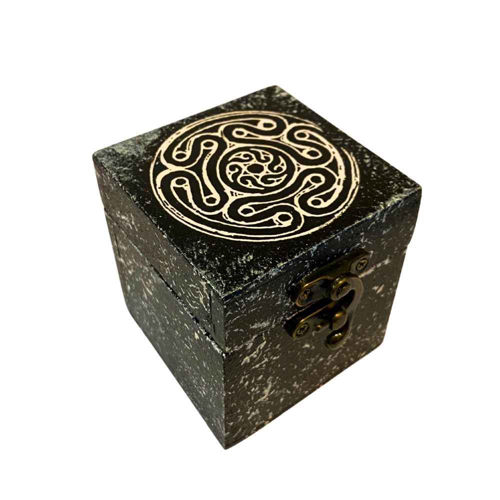 Caixa de espelhos Strophalos, símbolo sagrado associado aos mistérios, proteção e à roda da magia. Uma peça perfeita para quem caminha pela bruxaria e deseja guardar pequenos itens com significado, como anéis, amuletos, cristais ou encantamentos pessoais.