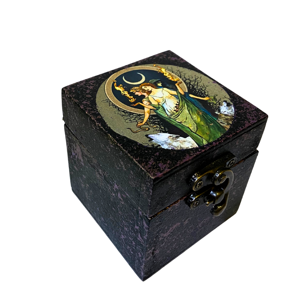 Caixa de espelhos Hécate, a Deusa Tríplice, representada em sua forma de guardiã dos caminhos, das transformações e da magia ancestral. Uma peça simbólica para altar, proteção e rituais de conexão espiritual.