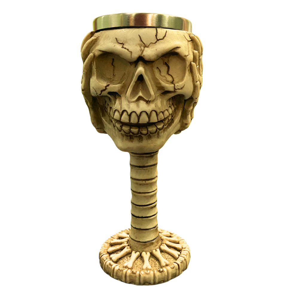 Ligado a Exu Caveira, guardião dos portais entre os mundos, o cálice torna-se um ponto de firmeza e respeito. Ele é utilizado para firmar a presença, oferecer bebidas, realizar orações, pedidos de proteção, limpeza espiritual e fortalecimento energético. Ao ser colocado no altar, funciona como um elo de comunicação, honrando as forças ancestrais e pedindo clareza, direção e proteção contra influências negativas.