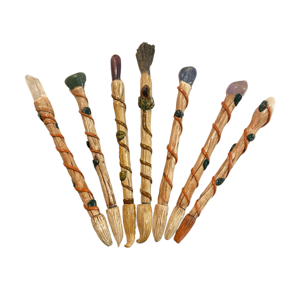 Cada caneta é adornada com cristais naturais, cada um escolhido por suas propriedades energéticas e beleza única
