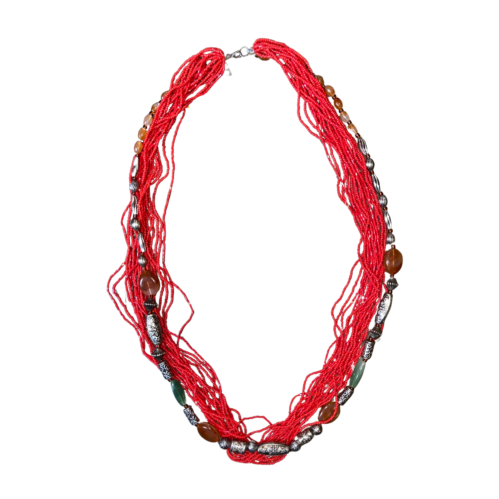 Peça artesanal composta por múltiplas voltas de miçangas vermelhas, entrelaçadas com contas trabalhadas em tons metálicos e pedras sintéticas que dão charme e destaque ao colar. Seu design vibrante transmite energia, proteção e elegância, tornando-o um acessório único para complementar qualquer visual.
