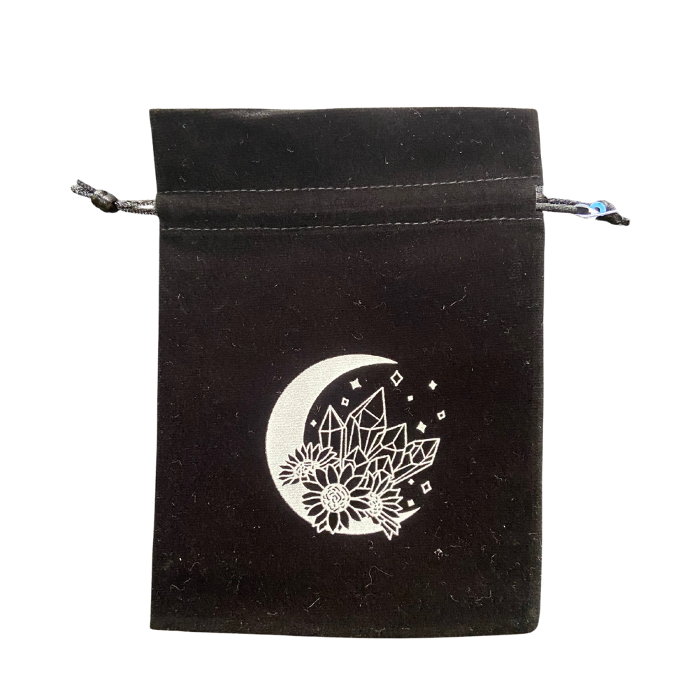 Saquinho de veludo preto com estampa prateada de lua e cristais entre flores. Une o brilho lunar à energia da Terra, simbolizando equilíbrio, renascimento e beleza mística. Ideal para proteger cristais, runas ou objetos de conexão espiritual.