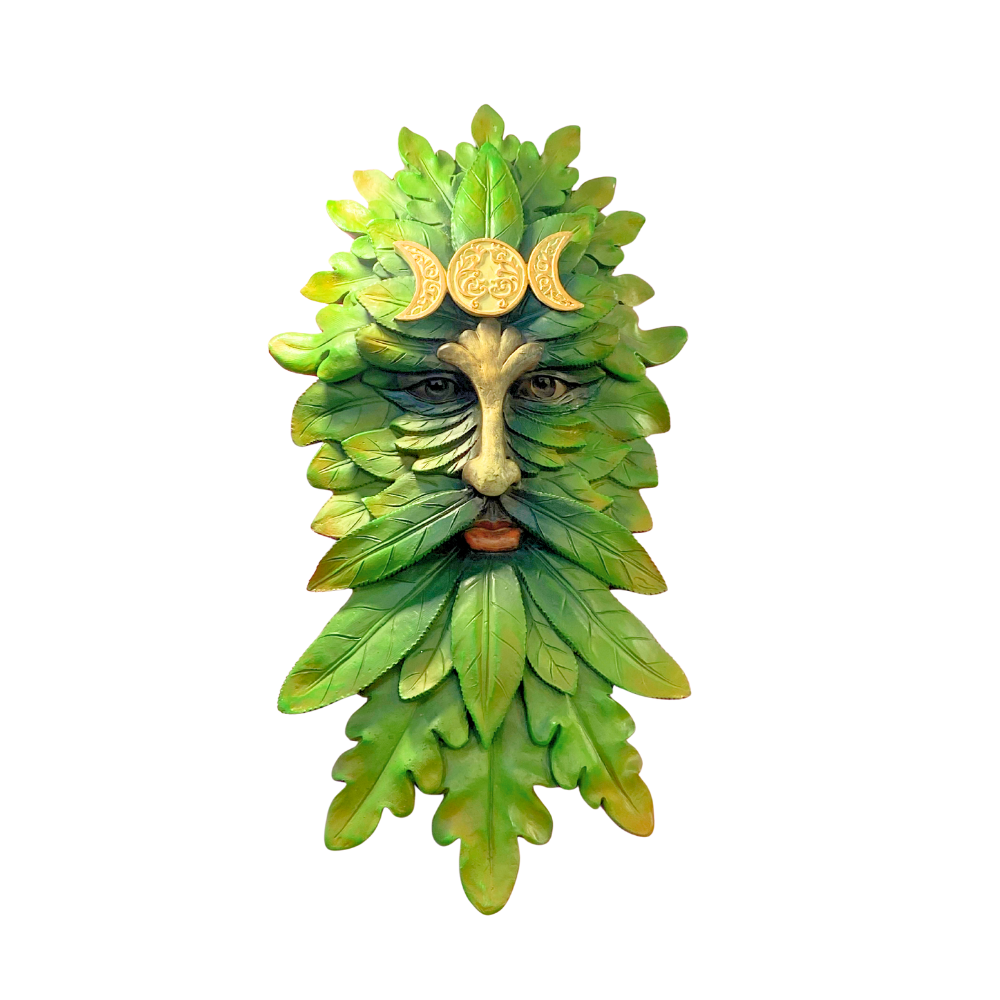 Esta peça representa o Green Man, o homem das folhas, guardião das matas e espírito ancestral da natureza selvagem. Com cerca de 60 cm de altura, sua face formada por folhas simboliza renovação, abundância e a energia vital que permeia todas as coisas vivas. O adorno lunar dourado reforça sua conexão com os ciclos naturais e a sabedoria antiga. Um artefato místico que evoca a força dos antigos cultos da natureza e a magia profunda das florestas.