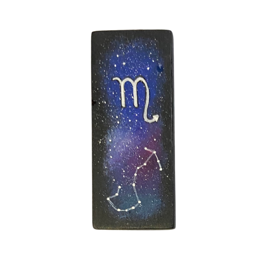 Feito em madeira pintada à mão, este imã traz o símbolo e a constelação de Escorpião sobre um fundo cósmico em tons de azul e roxo, evocando o mistério e a intensidade do signo.