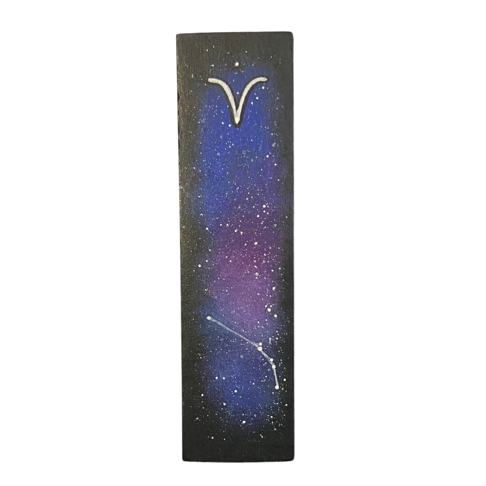 Feito em madeira pintada à mão, este imã exibe o símbolo e a constelação de Áries em um fundo cósmico vibrante, evocando a coragem e a energia do primeiro signo do zodíaco.