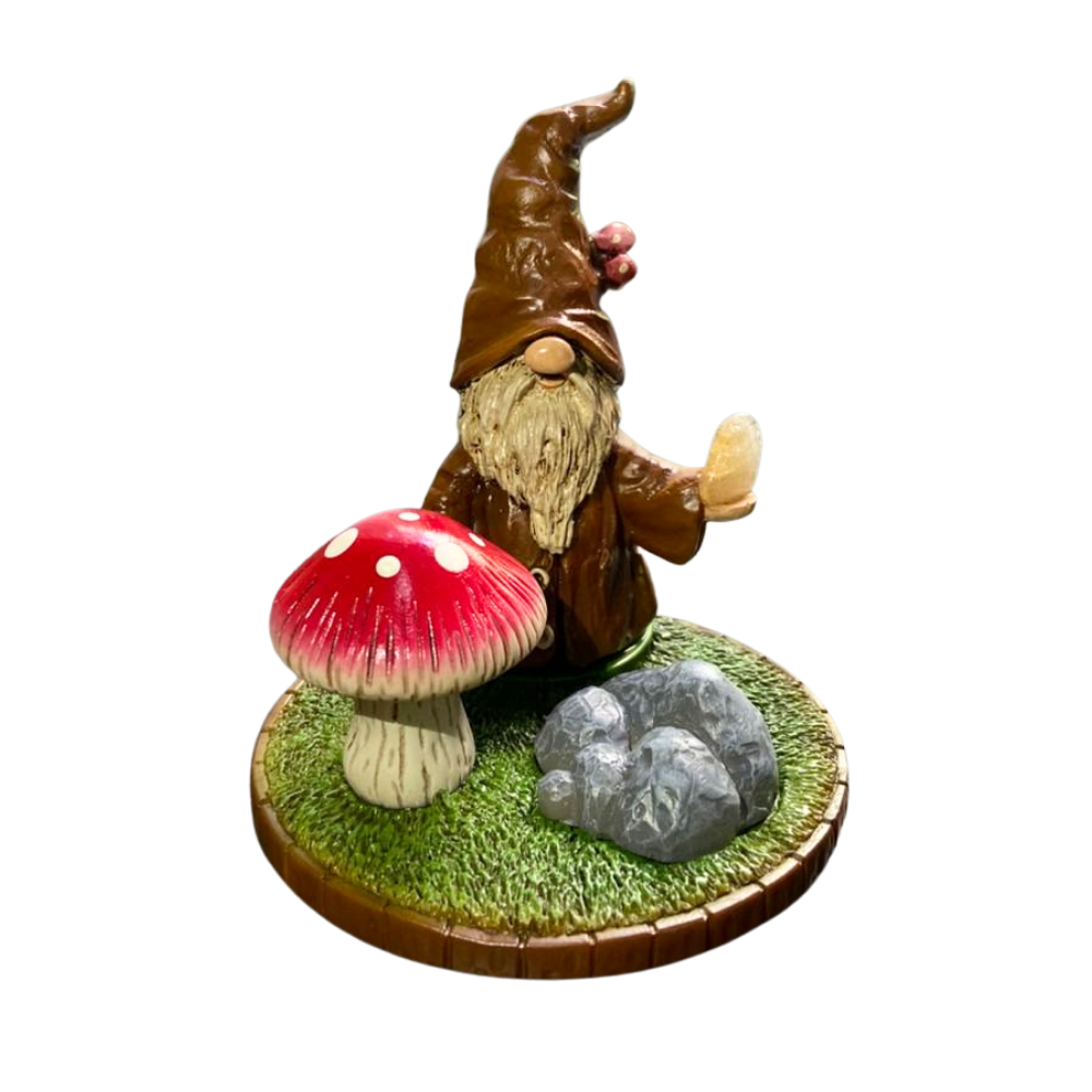 Um item encantador que une a magia dos gnomos com a energia natural dos cogumelos. Este incensário artesanal traz um gnomo simpático, acompanhado de um cogumelo colorido e pedras, criando uma atmosfera mística e acolhedora.