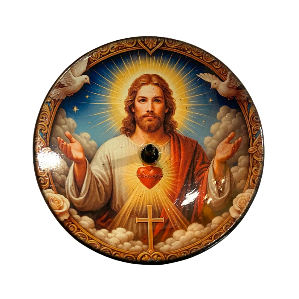 O incensário de Jesus simboliza fé, proteção divina e amor incondicional. A imagem de Jesus Cristo representa luz, misericórdia e esperança, trazendo conforto espiritual e fortalecimento da fé.
