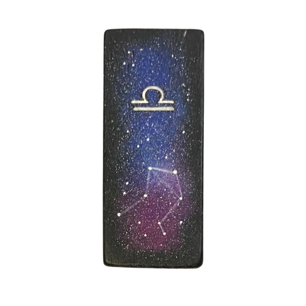 Produzido em madeira pintada à mão, este imã apresenta o símbolo e a constelação de Libra sobre um fundo cósmico em tons harmônicos, representando a busca pelo equilíbrio e pela beleza que marcam esse signo.
