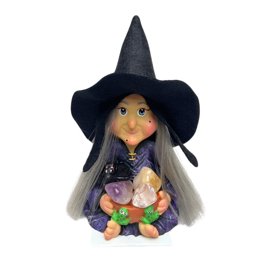 É uma sábia bruxa responsável pelo equilíbrio e alegria do seu lar. Traz consigo 3 pedras poderosas: a ametista, o citrino e o cristal. Está sempre acompanhada por animais mágicos: o morcego, que traz a vida longa, felicidade e prosperidade, os sapinhos que trazem proteção