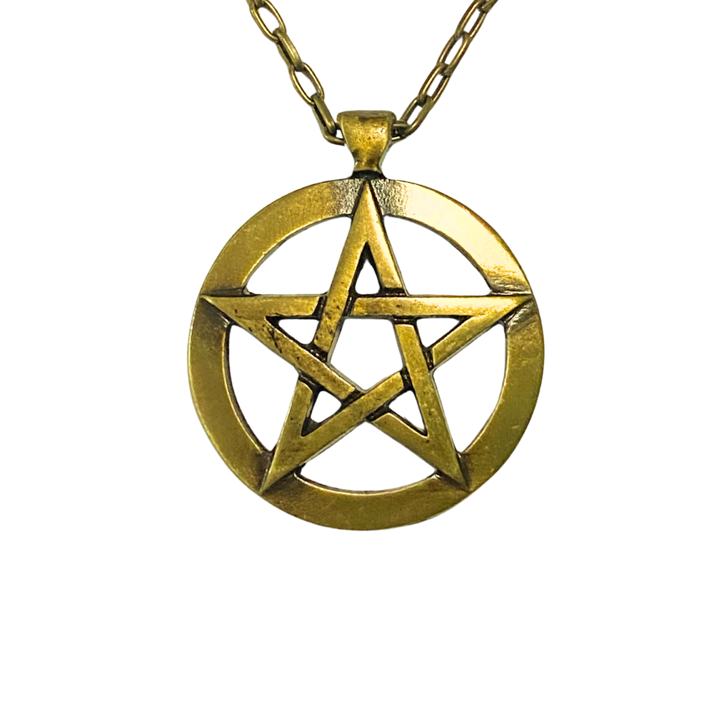 O colar de pentagrama é um dos amuletos mais tradicionais da espiritualidade e da bruxaria. A estrela de cinco pontas dentro do círculo simboliza o ser humano em equilíbrio com a natureza, onde cada ponta representa um elemento: terra, água, fogo, ar e espírito. O círculo ao redor indica proteção e unidade, mostrando que todas essas forças estão harmonizadas.
