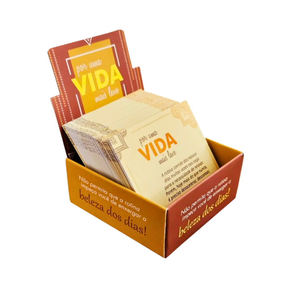 Caixinha contendo 100 cartões com frases que reforçam a ideia de que os dias atuais também pedem momentos para desacelerar e contemplar...