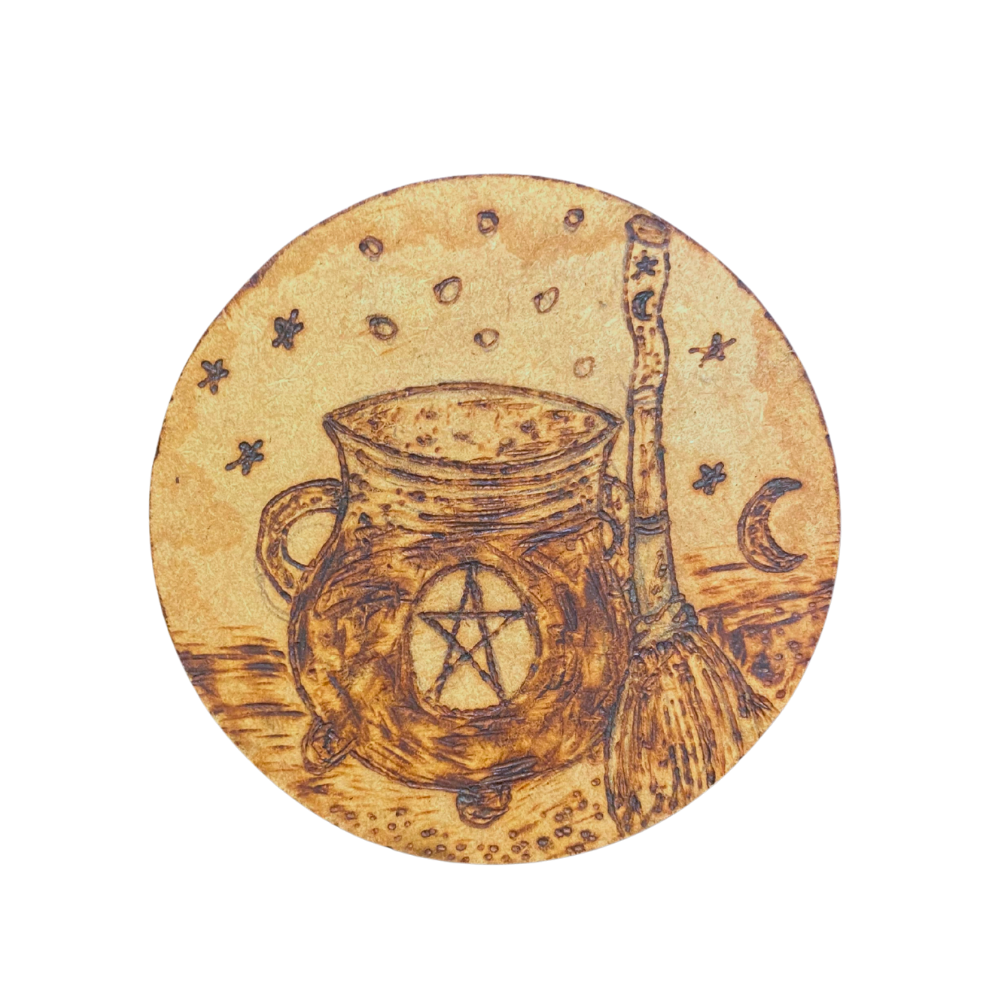 Transformado em porta-copo, esse símbolo traz ao cotidiano um toque de magia prática: protege a superfície, ao mesmo tempo em que evoca criatividade, intuição e a energia alquímica das bruxas. É um item decorativo que inspira rituais leves, momentos especiais e aquele charme místico no dia a dia.