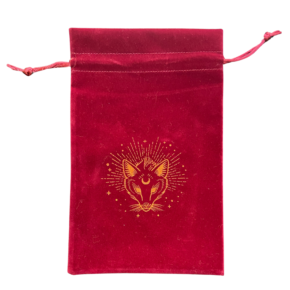 Saquinho de veludo vinho com estampa dourada da raposa lunar, guardiã dos segredos e da sabedoria ancestral. Evoca intuição, astúcia e poder de observação — a energia da bruxa que tudo enxerga. Perfeito para guardar baralhos de tarot, talismãs e pequenos instrumentos mágicos.